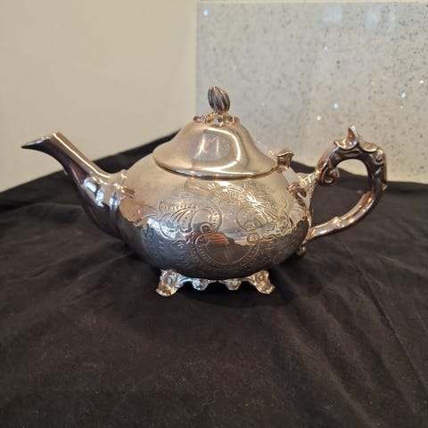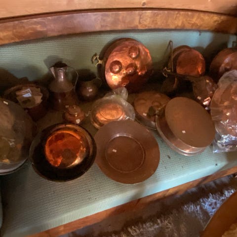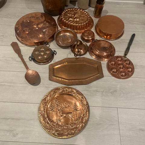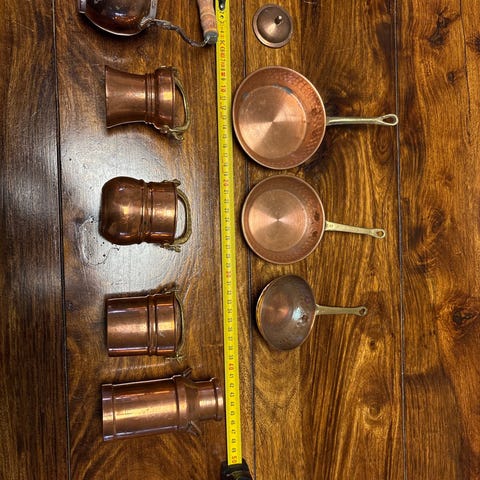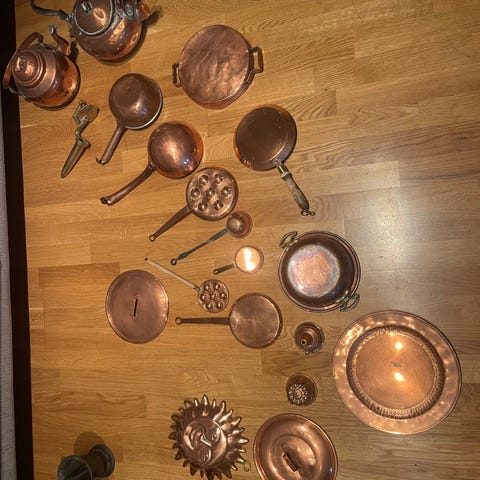 Sett bestående av tekanner, kopper(merke: Dorre), brett og små skåler i kobber. Materialet er kobber, og settet inkluderer flere deler til servering av te. Farge: kobber. Usikker på pris, derfor 100kr pr stk- men åpen for bud:).