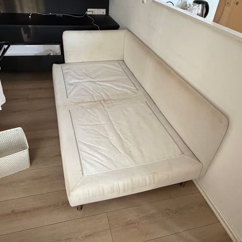 Gir bort en to-seter/tre-seter Søderhamn sofa fra IKEA. Bunnen må stiftes da stoffet har sluppet fra stammen (se bilde). Rygg og sitteputer medfølger. Andre puter medfølger ikke. Ben medfølger.