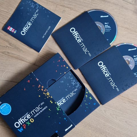 Microsoft Office Mac 2008 Home and Student Edition programvare med installasjonsveiledning og installasjons-CD. Programvaren inkluderer applikasjoner for hjem og studenter, kompatibel med Mac-operativsystem.