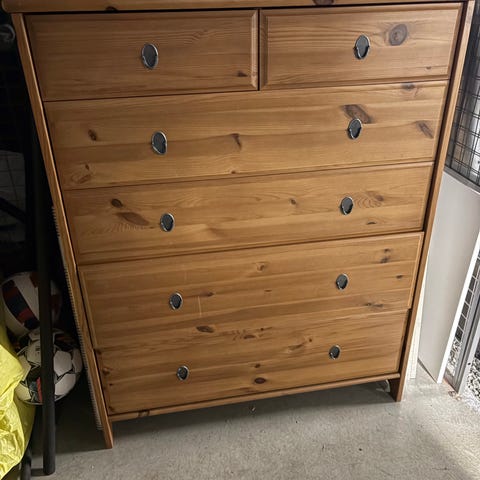 Kommode gis bort mot henting. Litt bølgete i overflaten oppå pga vannsøl (se bilde).