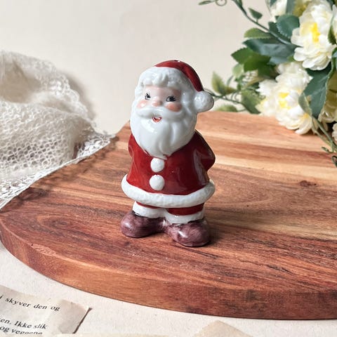 Søtt og klassisk sett med to julenisser i hvitt glasert porselen – brukt som salt- og pepperbøsser. Perfekt som juledekor på bordet.