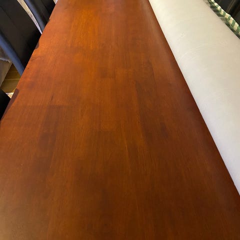 Bordet er 180 langt, men har klaffer som kan monteres for å gjøre det 280 langt. God plass til opp til 12 personer