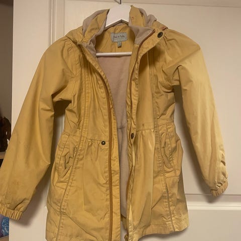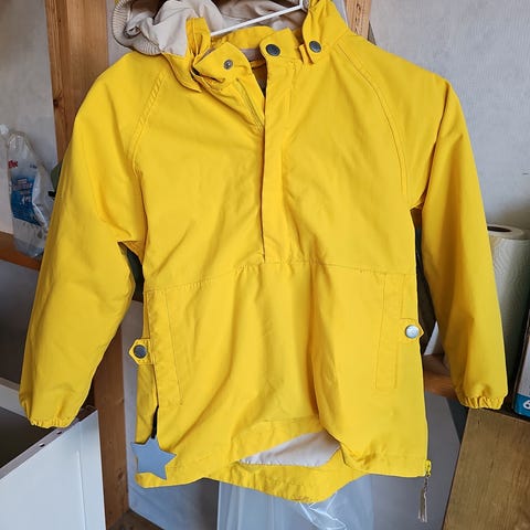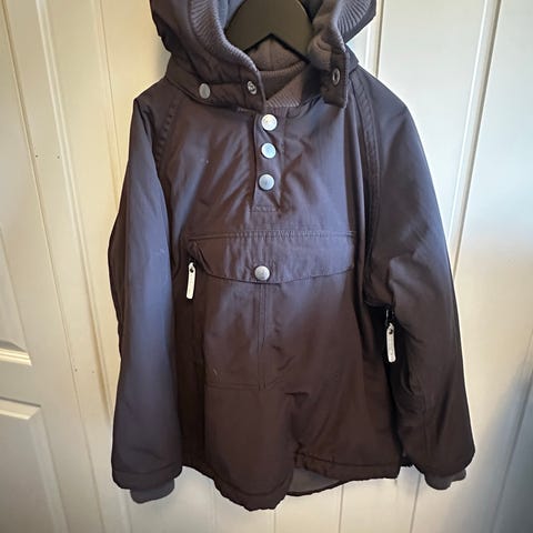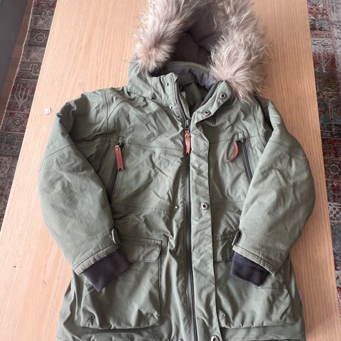 Pent brukt vinterjakke i str 128. Skiftet glidelås til metall, men tuppen er brukket av. Jakka er hel og pen uten anmerkninger.