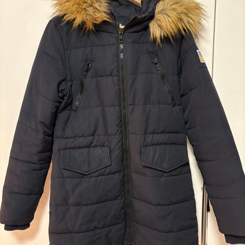 Avtagbar kant i fuskepels på hetten. Skjult trekksnor i livet på innsiden. Mansjett på enden av ermene. Selges da ungdommen i huset vokste fort fra den😅
