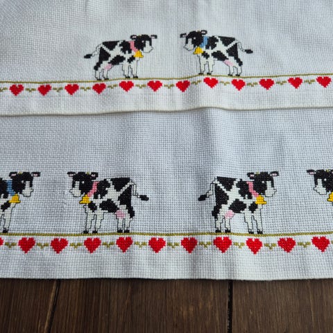 Pyntehåndkle som skal henge fra en pyntehylle. Nydelig brodert på et grovt stoff.