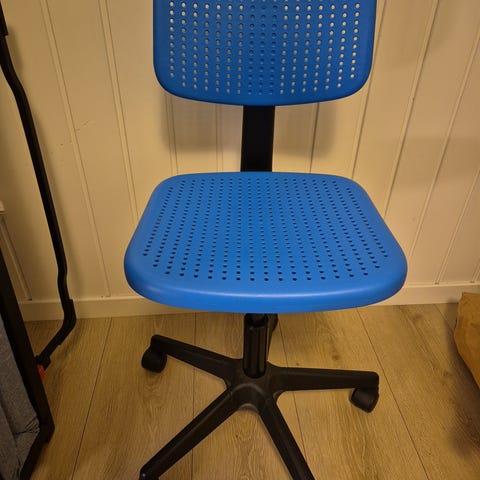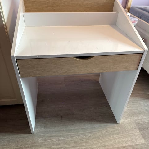 Pult til barn med tilhørende barnestol. Har en del flekker og rester av klistremerker (se bilde). Mye av papiret kan skrapes av. Må hentes. BxDxH : 80x 49x 60,5 (bordplate) / 73 (hylle).