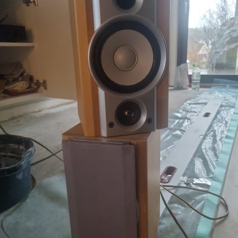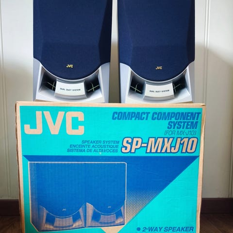 JVC SP-UXH10 høyttalersystem med 5 W effekt og 4 Ω impedans. Kabinett i lyst tre med stoffdeksel foran.
