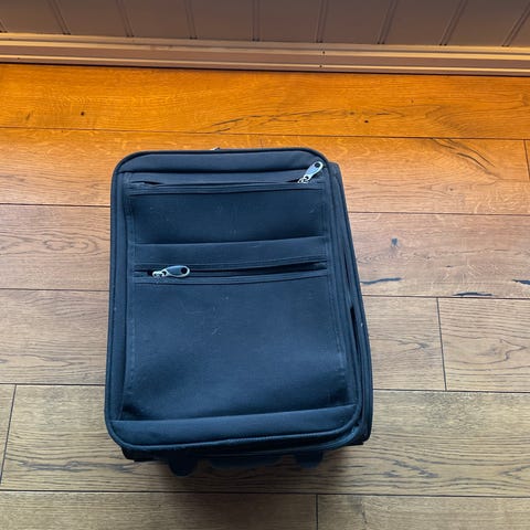 koffert laget i stoff. Kofferten har hjul og håndtak for enkel transport. Den har flere lommer for oppbevaring og lukkes med glidelås.