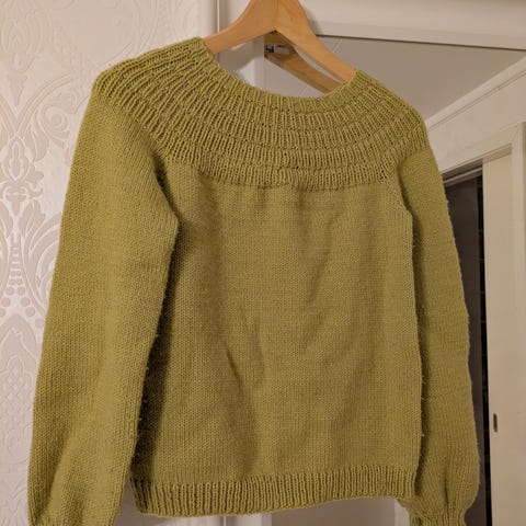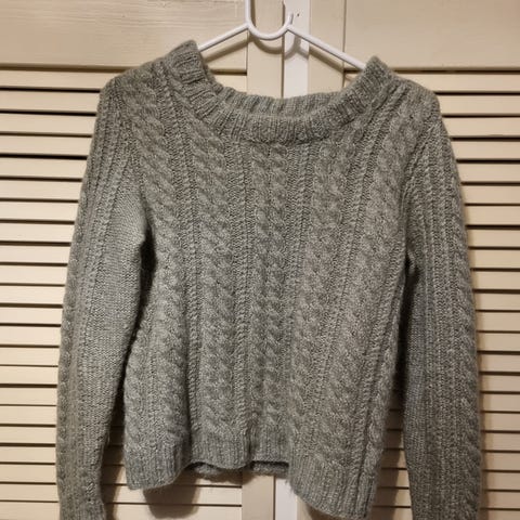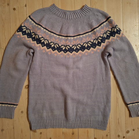 Pen hjemmestrikket ullgenser med flettemønster foran og bak. Se oppgitte mål på siste bilde.