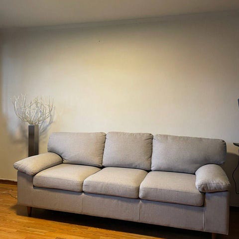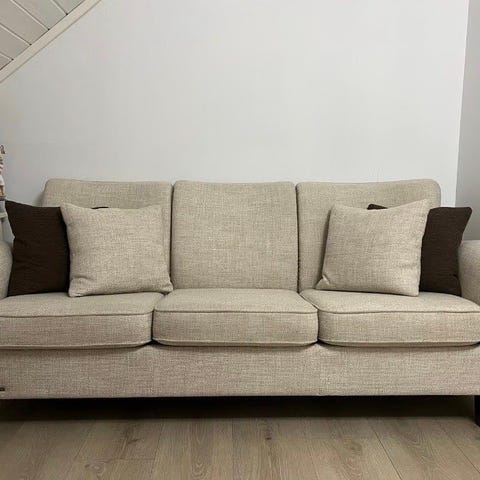 MÅ HENTES INNEN FREDAG 6. FEBRUAR: Selger vår Avignon 3-seter fra Furninova. Sofaen er 3,5 år gammel og pent brukt, uten flekker eller skader. Den har et tidløst design, trukket i beige bouclé tekstil med lyse eikeben. Passer godt inn i de fleste interiør.