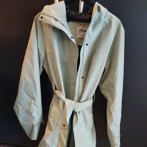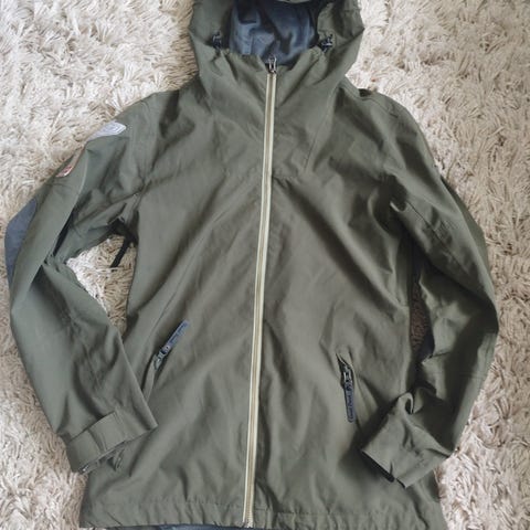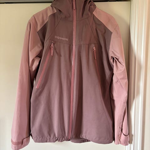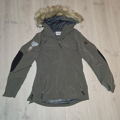 Daniel Franck damejakke i størrelse 36. Jakken har en kombinasjon av lyse og mørkere farger, med glidelåser på bryst og lommer. Egnet for ski eller turgåing.