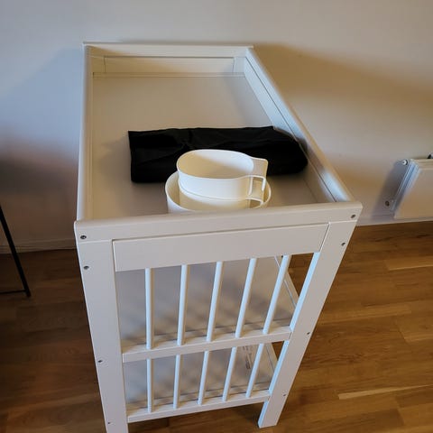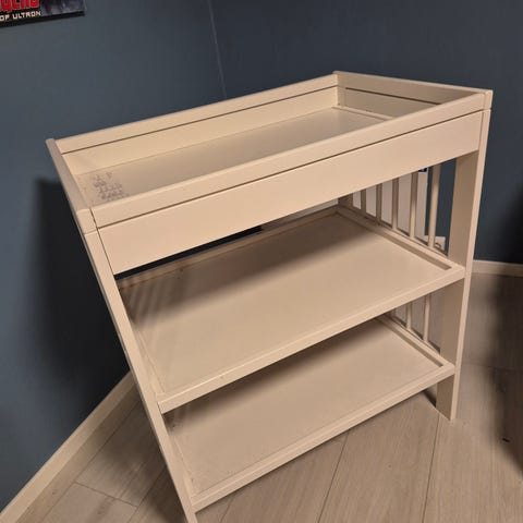 Pent bruk stellebord (Gulliver) fra IKEA i hvit tre. Har noen bruksmerker enkelte steder. Inkluderer oppbevaringsbokser som henges på kanten.. Passer for barnerom eller bad for enkel tilgang til nødvendigheter. Mål: høyde 95 cm, bredde 82 cm, dybde 54 cm.