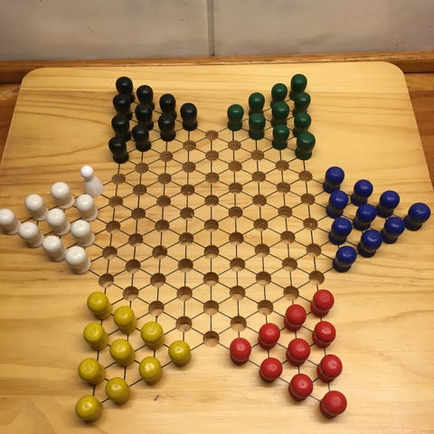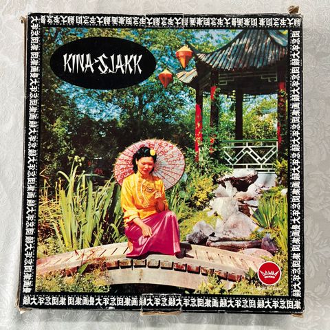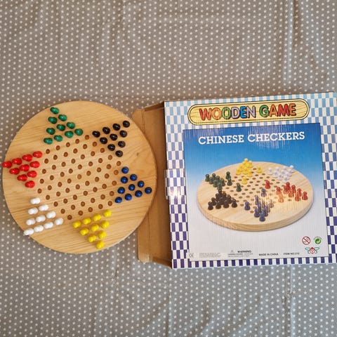 Kinasjakk brettspill laget av tre med fargede brikker i rød, blå, grønn, gul, oransje og turkis. Spillet har en rund form med plass til flere spillere og er egnet for sosialt spill og underholdning.