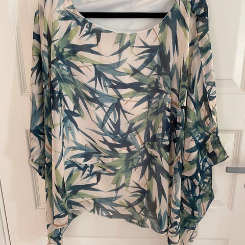 Fin topp/t-shirt til dame selges til kr 99,- Farge: turkis med motiv av sommerfugl i strass, se bilde. Str: L. Helt ny og ubrukt! Kommer fra røykfritt og dyrefritt hjem. Kan hentes på 3157 Barkåker.