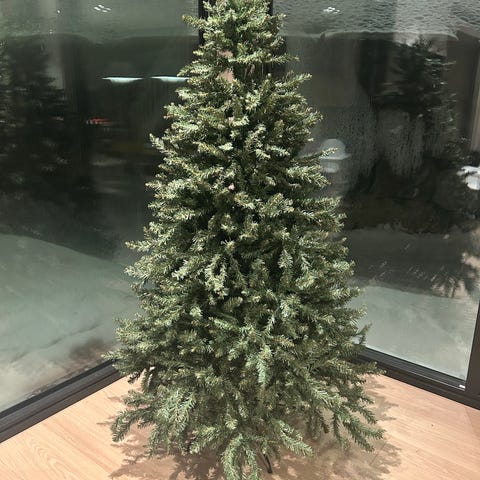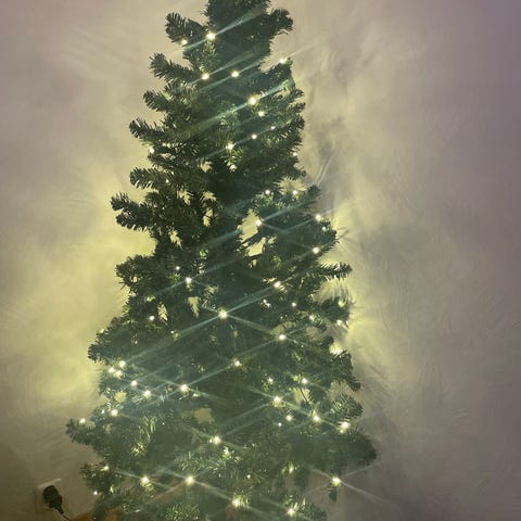 Juletre med lys og stjerne til salgs. 180 cm høyt. Nytt desember 2025. Noe pynt i gull og sølv medfølger. Ny pris ca. Kr. 3.300