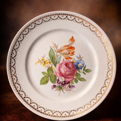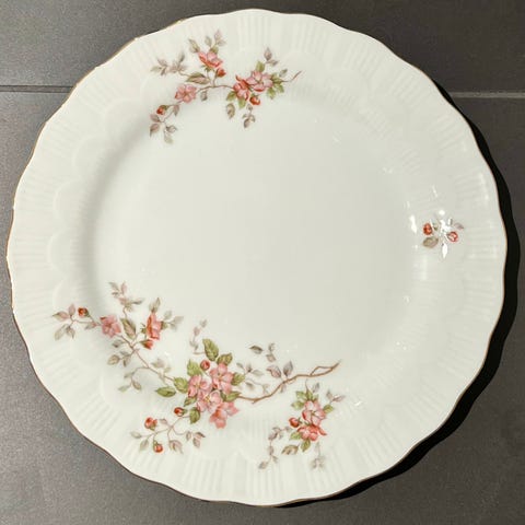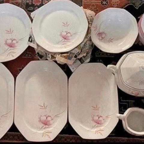 Serviset har dekorative blomster i røde og rosa nyanser.