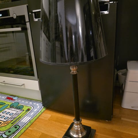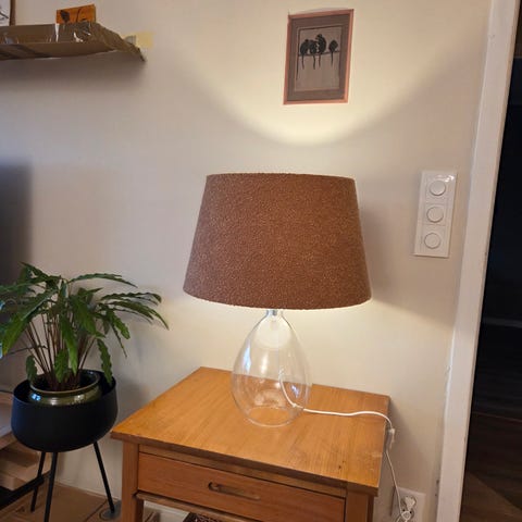 Ene lampen har en liten skade på skjermfestet, men skjermen sitter greit på, og en flekk på lampeskjermen bak.