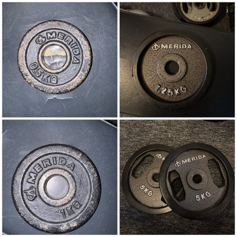 Selges da jeg innser at jeg ikke kan ta vare på alt som ser kult ut når ønske listen på gamle vektskiver er så lang og disse blir litt for nye for min del 😂 Alex skivene er jernvektskiver som er trukket i gummi. De er i meget god stand og er penere å se på en hva bilde klarer å vise. Som man kan se på bilde to er de noe mindre i størrelsen og vil da ikke gå i gulvet vis man feks har bumperere på stanga. Jeg vil anta de er ifra starten av 2000 tallet.