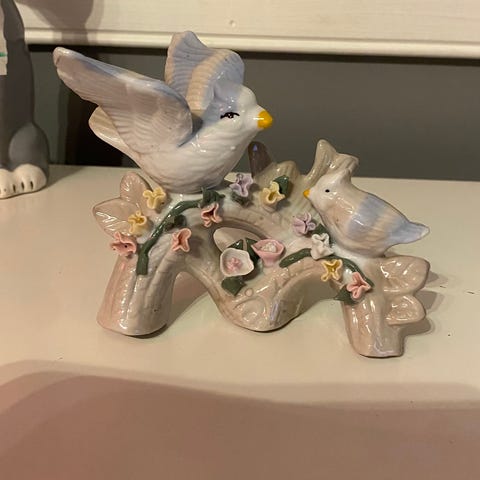 Ett fat og 4 små tallerkener med fuglemønster