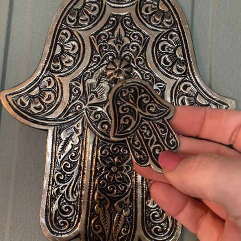 Dette er en innrammet hamsa-sjarm, også kjent som Guds hånd eller Miriamshånden, som er et gammelt og populært apotropaisk amulett for magisk beskyttelse. Den er montert på et rødt, vevd tekstil i en dekorativ metallramme, og vises i en gjennomsiktig boksramme