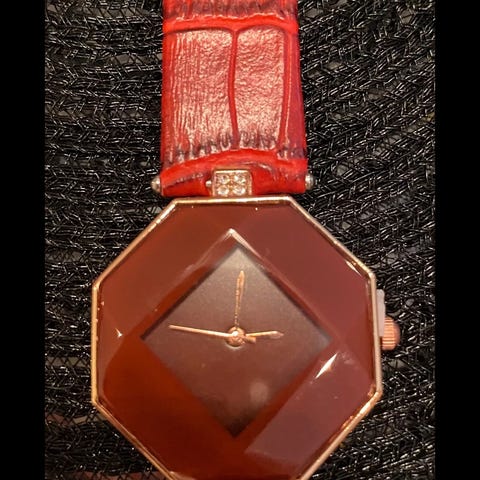 Fin dameklokke med strass stener rundt urverk, og justerbar meshlenke selges til kr. 100,- Farge: rosegull. Helt ny og ubrukt. Må sette inn batteri selv. Kan hentes på 3157 Barkåker.