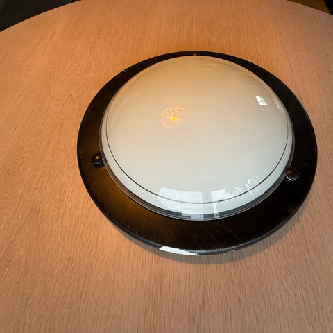 Tilstand: Lampen er i god visuell stand med en tøff finish. Den er utstyrt med moderne koblingsklemmer (Wago) i takkoppen, noe som gjør monteringen enklere. Som med alt brukt elektrisk utstyr, anbefales en rask sjekk ved montering.