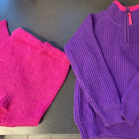 Sett med to gensere og en bukse som passer fint under vinterdressen i barnehagen/skolen. Er brukt ca fra 4-6/7 år her. Veldig fleksibelt i størrelsen. Strikk i livet som kan strammes på buksa.