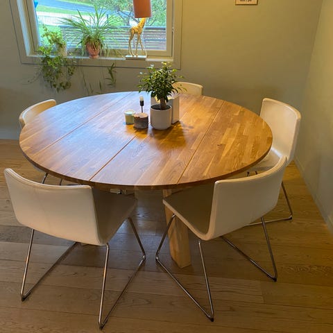 Selger 4 spisestoler fra skeidar. Ca 2 år gamle, brukt halvannet år. Det er små huller/merker i stolputene (kommet av katteklør). Den ene stolen er litt skeiv under ved skruene.