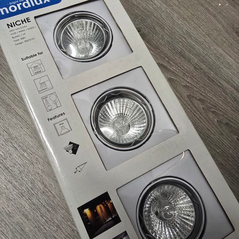 Downlight pakke med 25m kabel, 6 lavtbyggende takbokser og 6 downlights. Dimmer følger ikke med men kan kjøpes hos elektroimportoren for 229kr. Nytt i eske. Prosjekt det ikke ble noe av.
