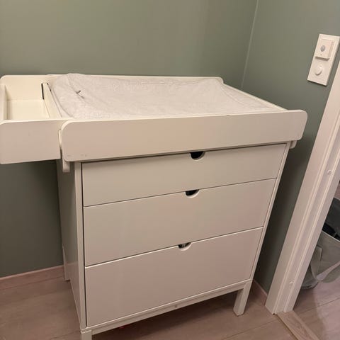 Veldig pent brukt stellebord med kommode fra Stokke i fargen Hazy Grey. To hvite laken til stellematte følger med.