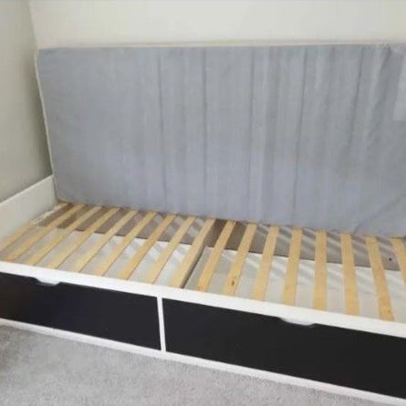 Godt brukt IKEA Släkt seng til salgs. Den er synlig brukt med noen merker nedi ene skuffen til høyre, og helt oppe på sengen til venstre.