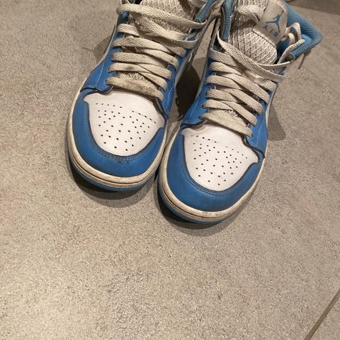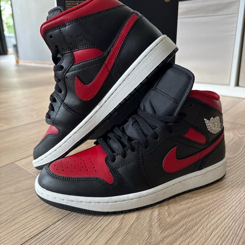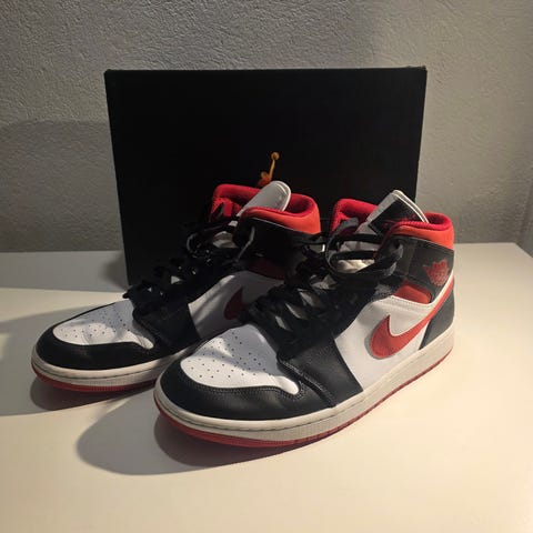 Air Jordan 1 Mid sneakers i størrelse 43. Fargene inkluderer hvit, mørk grå og svart. Skoene er designet som joggesko og har en kombinasjon av materialer for komfort og støtte. Skolen har blitt brukt 2-3 ganger, men har kjøpt nye og vil selge dem fordi de er bare i veien og blir ikke brukt. Pris kan diskuteres ved rask handel🤗🤗