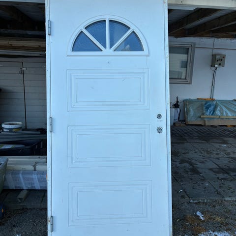 Komplett hel og klar til nytt hjem Hvit ytterdør med dekorative glassfelt. Døren har håndtak og låssystem. Rammen er også inkludert Egnet for inngangspartier i bolig. Str 210x95cm