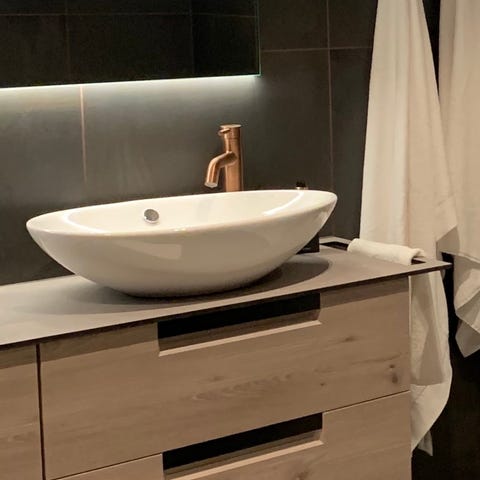 Servantskap med treplate, hvit servant og speil. Passer til baderom, gir oppbevaringsplass under vasken og en overflate for toalettartikler.