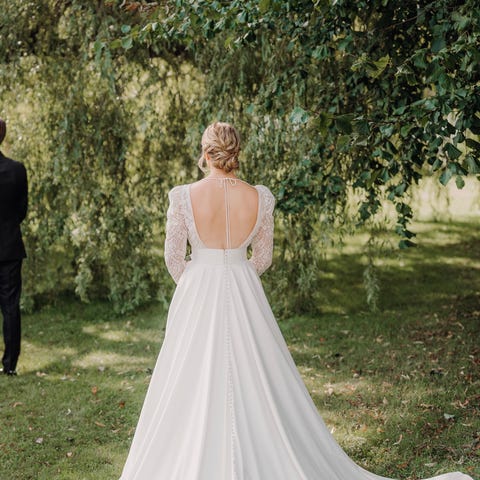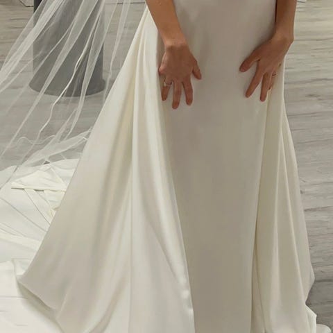 Kjøpt på Belle amie i Bergen i 2025. Opprinnelig med slep, men dette ble tatt vekk av skredder. Nydelige blondeermer laget av slepet. Er 171 cm høy, bruker vanligvis str L.