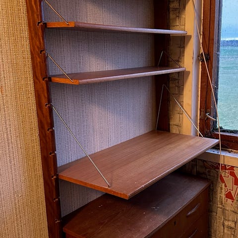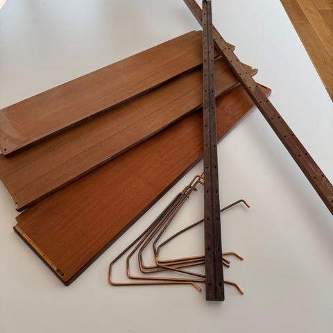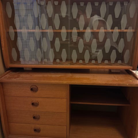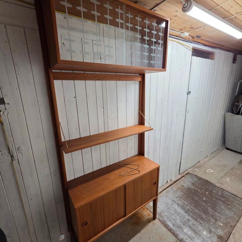 Vegghengt teak veggseksjon der underskapet er med teakhylle, skuff og teak skyvedører. Videre oppover er det en hylle med to mørkere ringer, så et skap med glasshylle og glass skyvedører. Og på toppen en hylle.