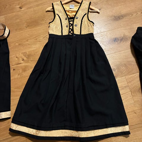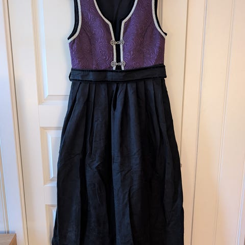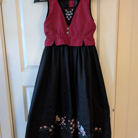 Festdrakt i strl 152/158 selges. Selges uten skjorte. Uten skader som vi kan se, men kommer fra hjem med kattehår så kan nok være litt hår på kjolen.