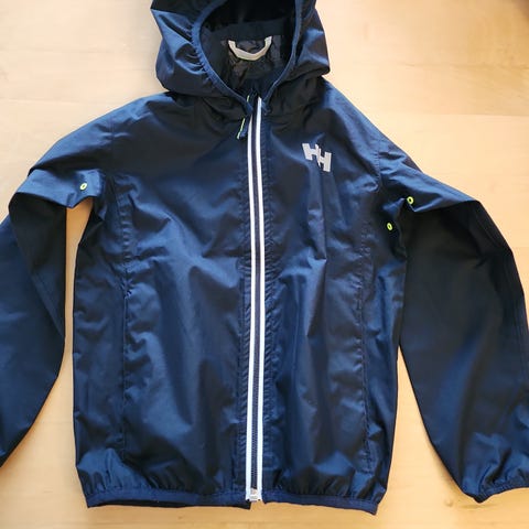 Helly Hansen regnjakke str. 122 med avtagbar hette. Pent brukt. Mye bruk igjen.