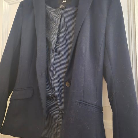 H&M Blazer i størrelse XS, står størrelse 38, men passer en XS. Farge: hvit med svarte striper. Materiale: bomull. Designet for kvinner.