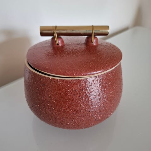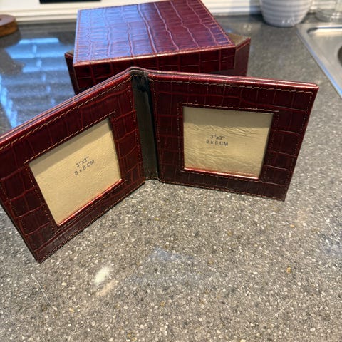 Diameter målt under er 11 cm. Rødbrunt lær med dekor på lokk og på utsiden av boksen. Liten skrape inni lokk (se bilde).