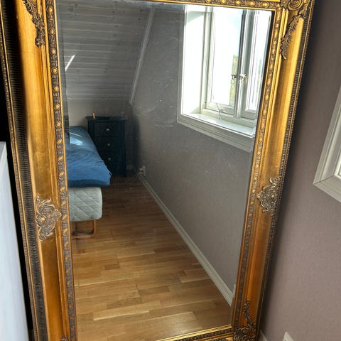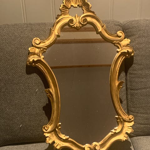 dekorasjonsornament speil sett bestående av to speil med detaljerte rammer i dekorativ stil. Speilene har ulik form, en oval og en mer rektangulær med buede kanter. Rammefarge i mørk bronse/gull tone. Egnet for innendørs bruk som veggdekorasjon. Halvstore.
