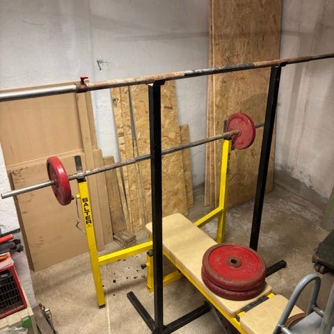 Selger komplett vektstangsett med forskjellige vektskiver. Settet inkluderer én lang stang og to korte stenger, slik som vist på bildene. Alt er brukt, men i god stand og fullt funksjonelt.