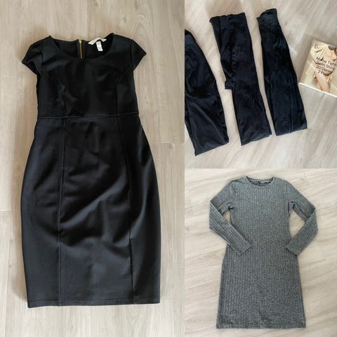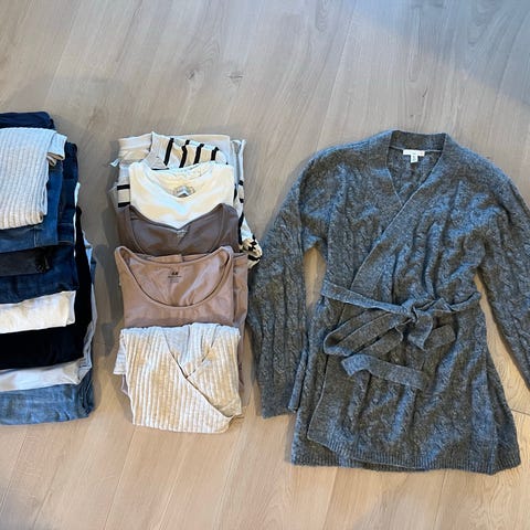 Fire gravidjeans/gravidbukser/olabukser for gravide, 3 i størrelse Small (grå, lys denim og litt mørkere denim med «slitte» knær og frynser nederst), én i størrelse Medium (sort med glidelåser nederst og på forlommer)