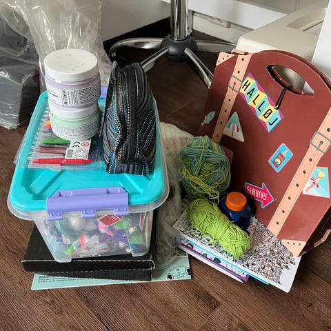 Ellers følger det med blant annet limpistol, øyer, pinner, pose med bomull, heklekroker i forskjellige størrelser og noe stoff i en "light in a box" eske.