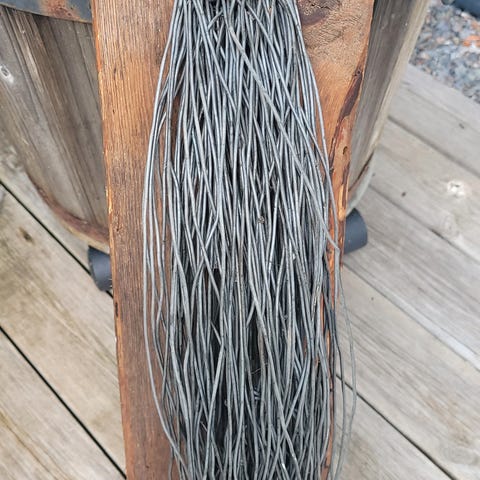 Galvanisert ståltråd i uavklart lengde og tykkelse, egnet for ulike bruksområder som binding, reparasjon og håndverk. 300 kr vet ikke kor lang