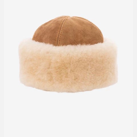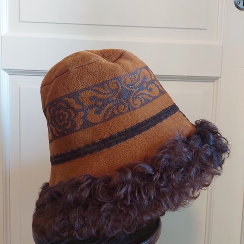 Saueskinnshatt. Pent brukt to ganger, ingen tegn til bruk. Str 60-62. Mørkebrun.