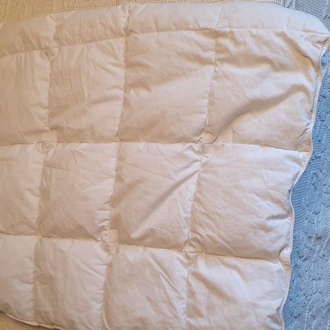 Har to ulike puter så du kan velge hvilken du vil ha med, en høyere (240gram) og en lavere (100gram). Begge er dun og av god kvalitet.