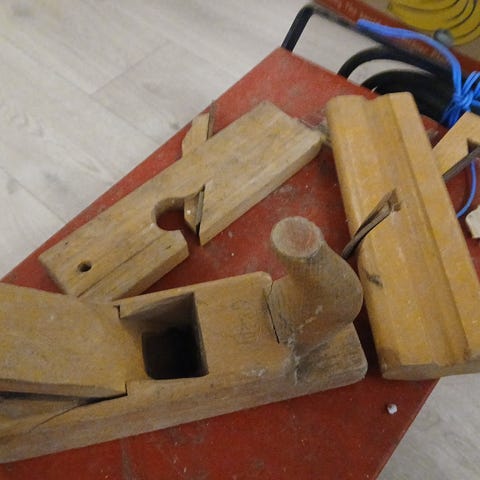 Treskjærerverktøy laget i tre, brukt til håndverk og treskjæring. Verktøyet har en enkel konstruksjon med ulike deler for å forme og bearbeide treverk.en del rust 300 kr for alt samlet