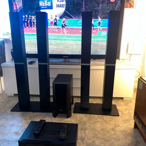 Hei! Selger et eldre hjemmekino anlegg av merket Pioneer. Består av 2stk front + center og 2stk bakhøyttalere å forsterker. Spiller veldig bra. Funke bra på både film å musikk.