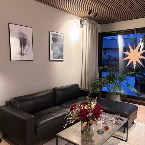 1. Det ene benet til sofaen har en litt skjev gjenge (ikke noe vi merker).